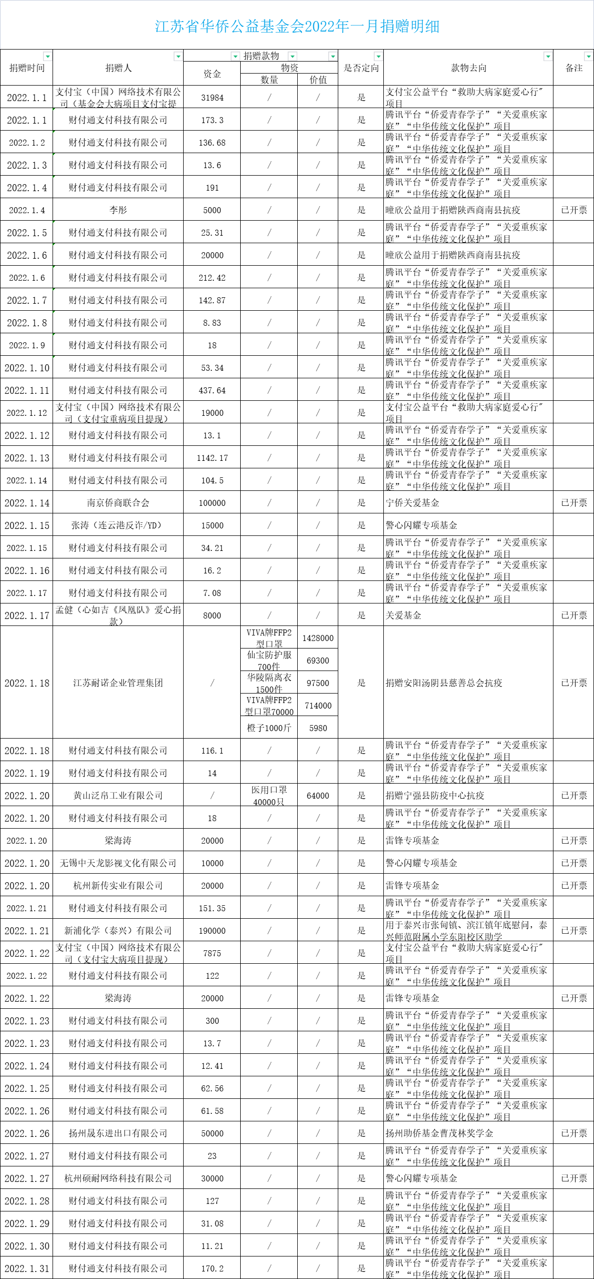 江蘇省華僑公益基金會(huì)2022年一月捐贈(zèng)明細(xì)