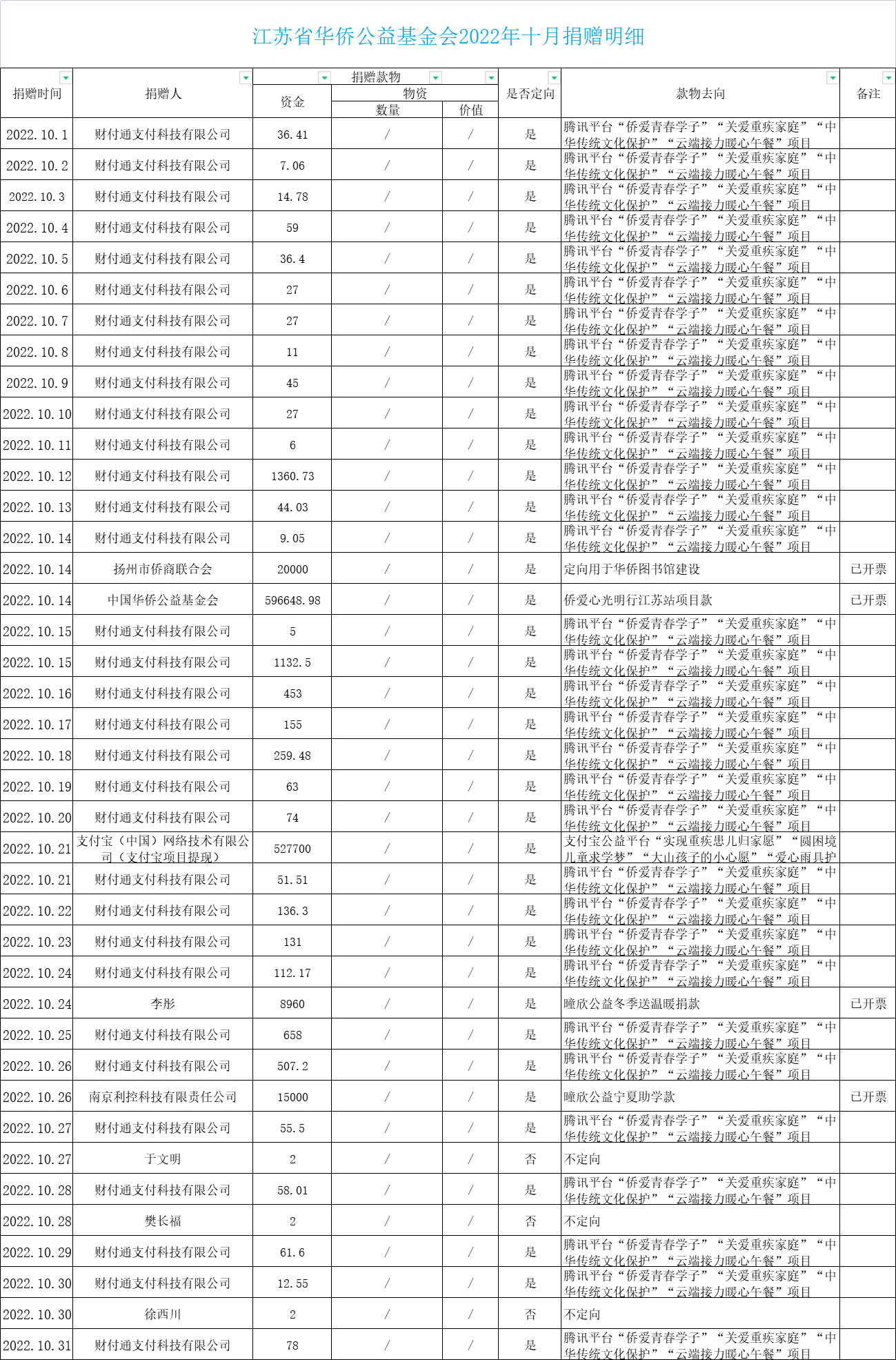 江蘇省華僑公益基金會(huì)2022年十月捐贈(zèng)明細(xì)