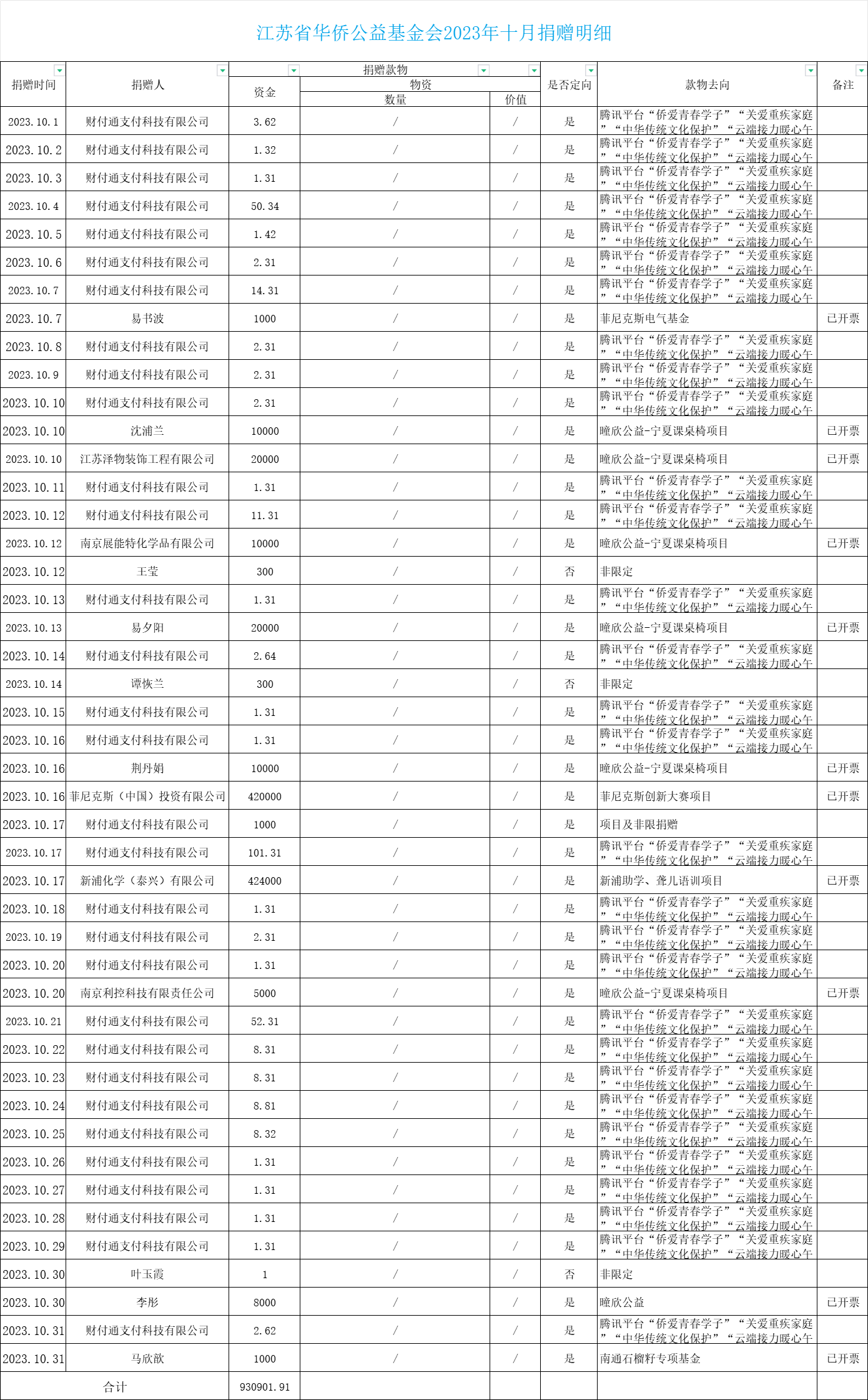 江蘇省華僑公益基金會(huì)2023年十月捐贈(zèng)明細(xì)