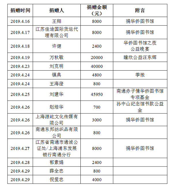 江蘇省華僑公益基金會2019年四月捐款明細(xì)