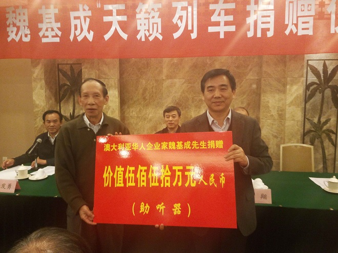 “魏基成天籟列車”是由澳大利亞紙業(yè)大王、澳大利亞ABC紙巾公司總裁、江蘇省華僑公益基金會榮譽會長魏基成先生于2009年創(chuàng)辦的慈善項目,旨在向貧困聽障者和聾啞兒童提供免費的助聽器,幫助他們走出無聲世界,解決其學(xué)習(xí)、就業(yè)和生活中的實際困難。此次“魏基成天籟列車”駛?cè)虢K,通過省華僑公益基金會向我省聽障青少年、兒童和有關(guān)學(xué)校捐贈2500臺助聽器和500臺語音教學(xué)機(價值約550萬元),向我省蘇北5市貧困老人捐贈5000件冬衣(價值約250萬元),合計捐贈物品價值達800萬元。加上今年10月17日“全國扶貧日”捐贈我省泗陽縣價值500多萬元的冬衣和助聽器,“魏基成天籟列車”今年已累計向我省捐贈價值1300多萬元的物品。該捐贈項目也是省華僑公益基金會自成立以來接受捐贈數(shù)額最大的一個公益項目