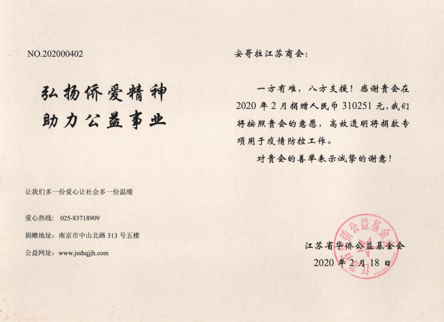 新冠肺炎疫情發(fā)生以來,安哥拉江蘇商會在全力應(yīng)對疫情的同時,心系祖國。在商會會長王林元先生號召下,安哥拉江蘇籍同胞積極為疫區(qū)捐款,共募得善款310251元,并于2月18日捐贈給江蘇省華僑公益基金會用于支持抗疫工作,體現(xiàn)了中華民族“一方有難、八方支援”的傳統(tǒng)美德。