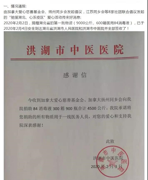 加拿大江蘇商會會長吳衛(wèi)東先生,聽說國內發(fā)生的嚴重疫情后,立即聯(lián)系了加拿大愛心慈善基金會、加拿大江蘇、南京、淮安、揚州同鄉(xiāng)會的多位在加僑領,在微信群廣泛動員,發(fā)起捐款倡議。經過三天不眠不休的緊張工作,募集到善款30多萬元人民幣,并協(xié)商制定了科學的捐贈方針:一要謀合作,勠力同心,克服困難,共同打響幫助祖國家鄉(xiāng)抗擊疫情防控阻擊戰(zhàn);二要謀速度,與時間賽跑,迅速行動起來,不計成本、加班加點,第一時間把募集到的醫(yī)療用品向國內輸送;三要謀精準,迅速與國內互通情況,千方百計購買國內最緊缺的物資,提供最急需的幫助。2月3日,第一批捐贈物資順利抵達國內,2月4日,第二批抵達……共5批急需物資為抗“疫”一線提供了“及時雨”。中國駐加拿大使館鼓勵僑胞們:要向第一個行動起來的吳會長學習!