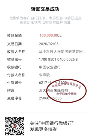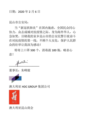 澳籍華人、澳大利亞昆山商會會長朱峰駿先生個人捐款10萬元,并購得12000只專業(yè)口罩、進口防護服及消毒液用于捐贈武漢協(xié)和醫(yī)院,并向昆山市公安局定向捐贈民用口罩及消毒液。