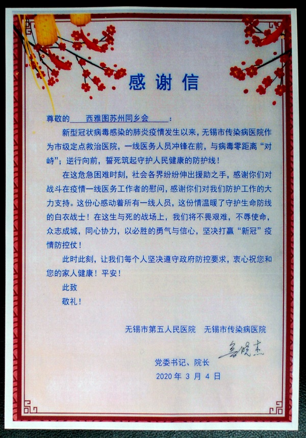 在感謝信中寫(xiě)到:一線醫(yī)服務(wù)人員沖鋒在前,與病毒零距離“對(duì)峙”;逆行向前,誓死筑起守護(hù)人民健康的防護(hù)線。他感謝西雅圖蘇州同鄉(xiāng)會(huì)對(duì)他們的防護(hù)工作的大力支持,愛(ài)心感動(dòng)并溫暖著守護(hù)生命防線的白衣戰(zhàn)士!在這生與死的戰(zhàn)場(chǎng)上,他們將不畏艱難,不辱使命,眾志成城,堅(jiān)決打贏“新冠”疫情防控仗!