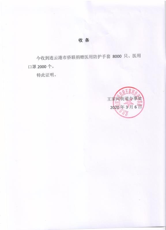近日,武漢市黃陂區(qū)王家河街道辦事處向連云港市僑聯(lián)發(fā)來(lái)捐贈(zèng)收據(jù)并向僑界群眾表示感謝。2月18日,連云港市僑界群眾向武漢疫區(qū)基層一線(xiàn)定向捐贈(zèng)的8000只醫(yī)用防護(hù)手套、2000只醫(yī)用口罩順利運(yùn)抵武漢,并在第一時(shí)間交付給街道負(fù)責(zé)人,助力武漢人民早日戰(zhàn)勝疫情。
