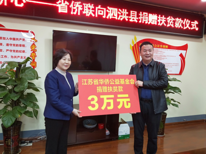 在捐贈(zèng)儀式上,周建農(nóng)代表省華僑公益基金會(huì)向泗洪縣瑤溝鄉(xiāng)捐贈(zèng)價(jià)值5萬元的棉衣棉被,向瑤溝鄉(xiāng)付圩村捐贈(zèng)扶貧款3萬元,瑤溝鄉(xiāng)黨委書記陳巖接受捐贈(zèng)。