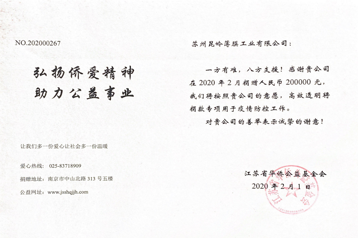 2月1日,蘇州昆嶺薄膜工業(yè)有限公司向江蘇省華僑公益基金會捐贈20元人民幣,用于支援抗擊新型冠狀病毒感染的肺炎疫情。省華僑公益基金會將用該筆捐款,緊急采購防疫急需醫(yī)療物資支持防疫一線單位。...