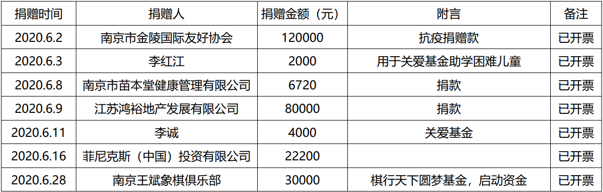江蘇省華僑公益基金會2020年六月捐款明細(xì)
