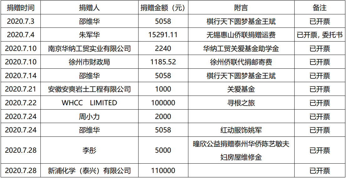 江蘇省華僑公益基金會(huì)2020年七月捐款明細(xì)
