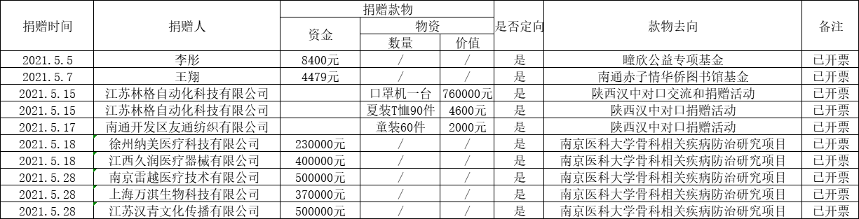 江蘇省華僑公益基金會(huì)2021年五月捐款明細(xì)