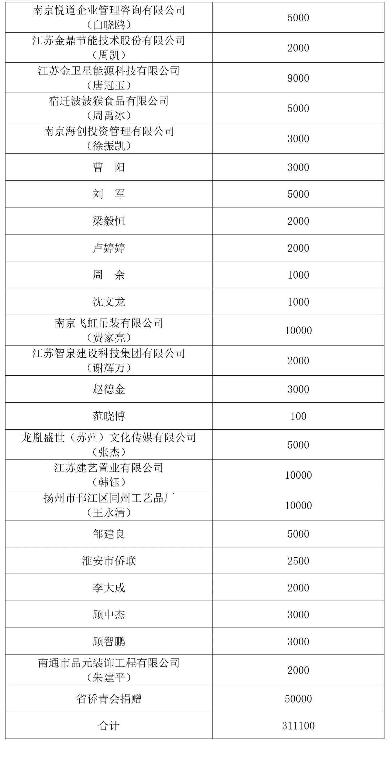 南京祿口機(jī)場(chǎng)發(fā)生的疫情,牽動(dòng)著海內(nèi)外僑界青年的心,紛紛通過(guò)各種方式表達(dá)關(guān)切、提供支持。7月26日,江蘇省僑聯(lián)青年委員會(huì)召開(kāi)三屆四次會(huì)長(zhǎng)會(huì)議,決定在江蘇省華僑公益基金會(huì)設(shè)立“僑青助力抗疫”捐贈(zèng)項(xiàng)目,倡議廣大僑界青年奉獻(xiàn)愛(ài)心、支援一線抗疫。截止7月29日下午17時(shí),累計(jì)收到捐款31.11萬(wàn)元,其中省僑青會(huì)經(jīng)費(fèi)捐贈(zèng)5萬(wàn)元,接受僑青、僑胞和省僑聯(lián)聯(lián)誼聯(lián)絡(luò)部黨支部捐款26.11萬(wàn)元?,F(xiàn)予公示。