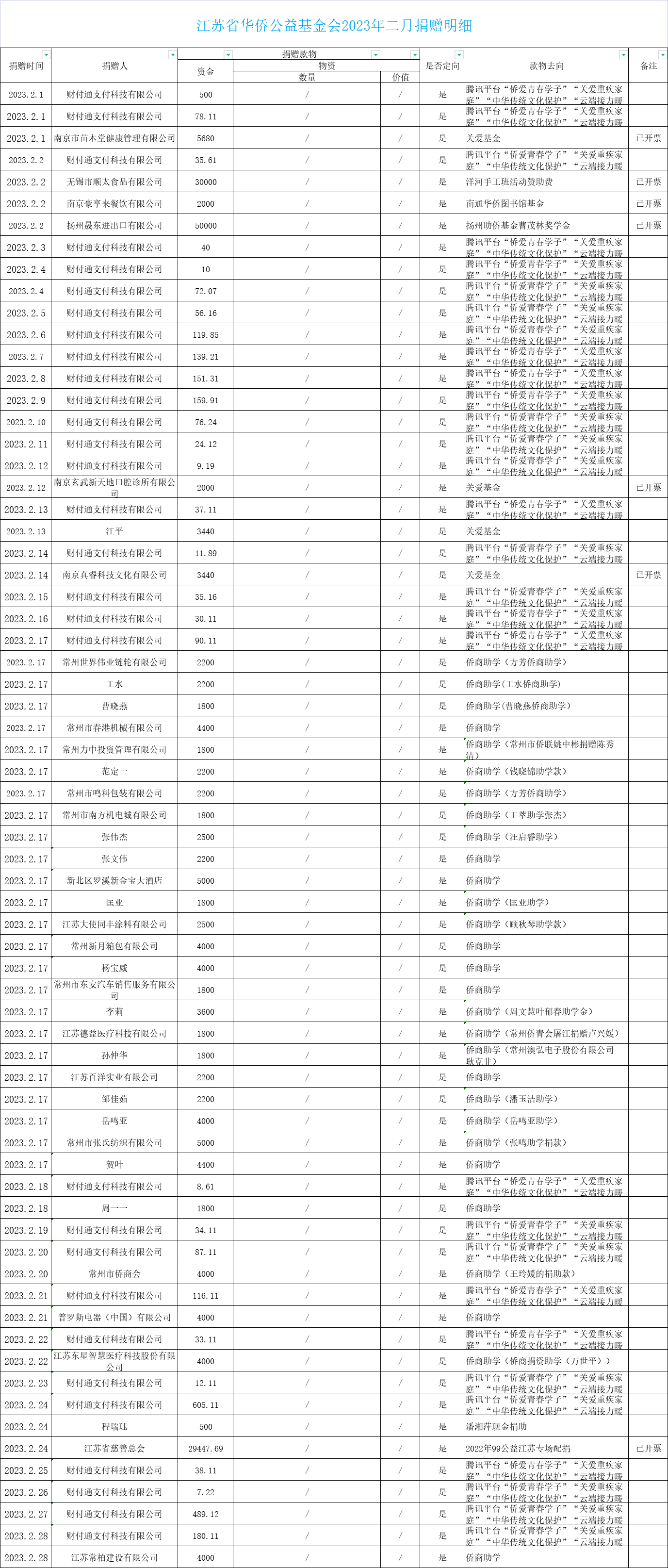 江蘇省華僑公益基金會(huì)2023年二月捐贈(zèng)明細(xì)