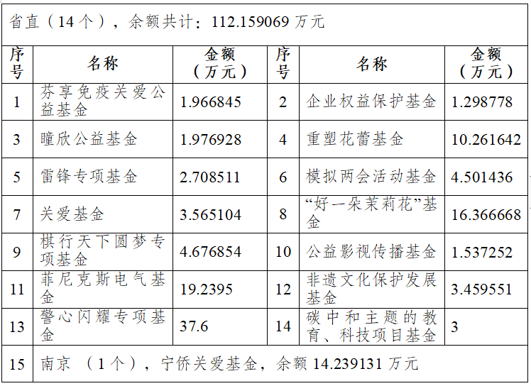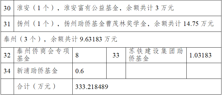截止2022年12月31日,省華僑公益基金會(huì)秘書處經(jīng)理事會(huì)同意,續(xù)簽19個(gè)專項(xiàng)(項(xiàng)目)基金,終止5個(gè)專項(xiàng)(項(xiàng)目)基金,日前共設(shè)有專項(xiàng)(項(xiàng)目)基金34個(gè),合計(jì)余額333.002004萬元。