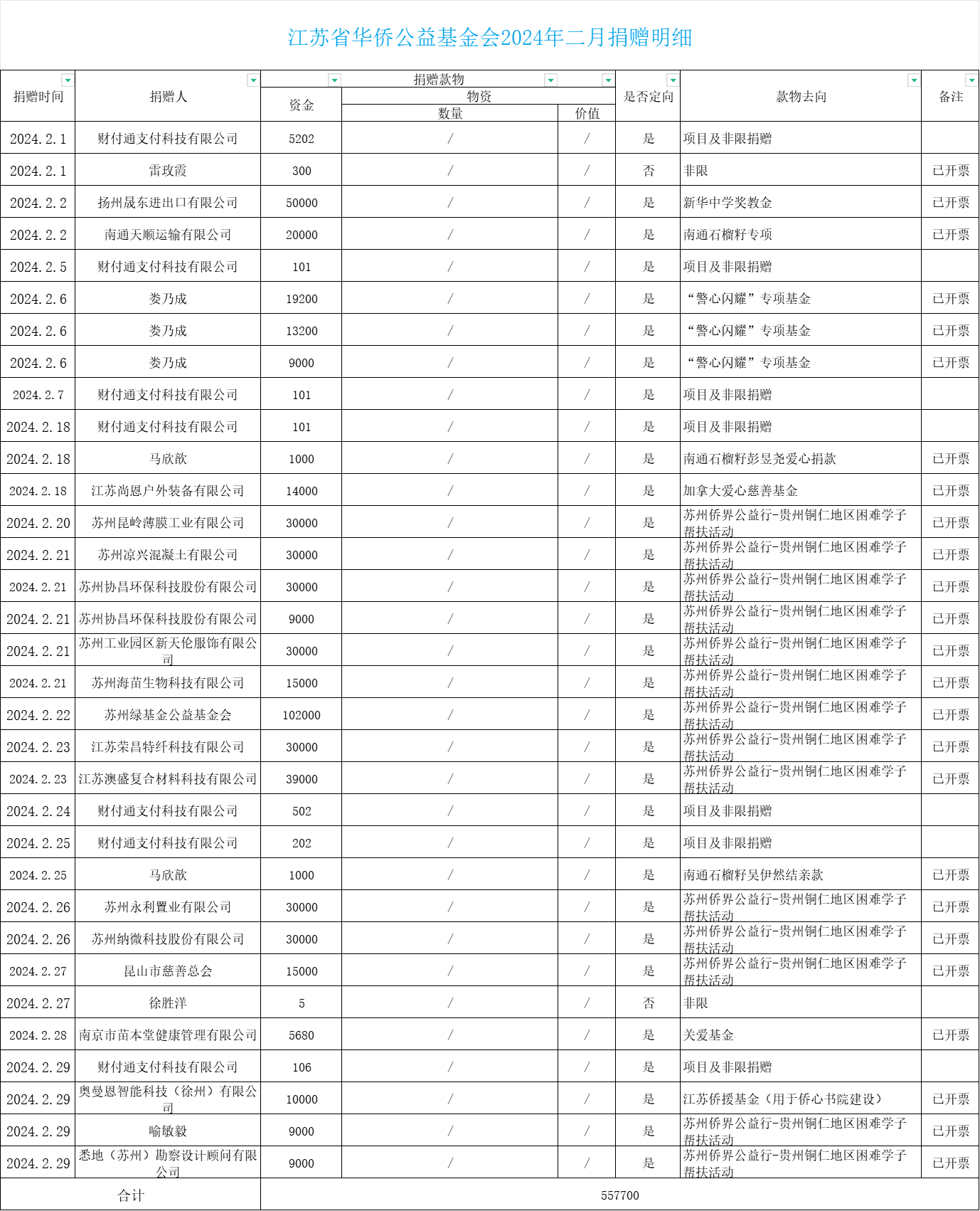 江蘇省華僑公益基金會2024年二月捐贈明細(xì)